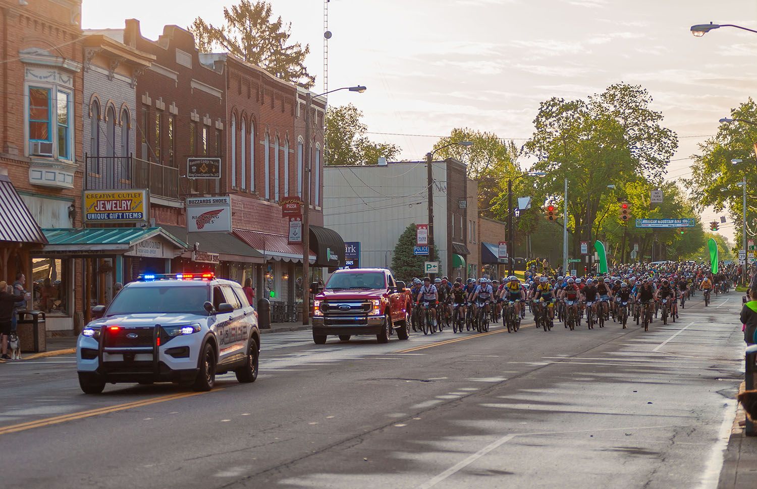 All Races, 100 mile, 100k and 50k, mass rolling start with racers released at the city limits